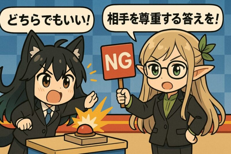 どちらでもいいやどちらでも構いませんといった表現は、同僚間では問題なくても、取引先や上司にはぶっきらぼうに受け取られる可能性があります。大丈夫という言葉も同様にビジネスの場では軽く感じられるため、避ける方が安心です。文化庁の敬語指針でも、場面に応じた敬語選択の重要性が示されています【4】。適切な言葉を選ぶことが、信頼感を損なわないための基本です。