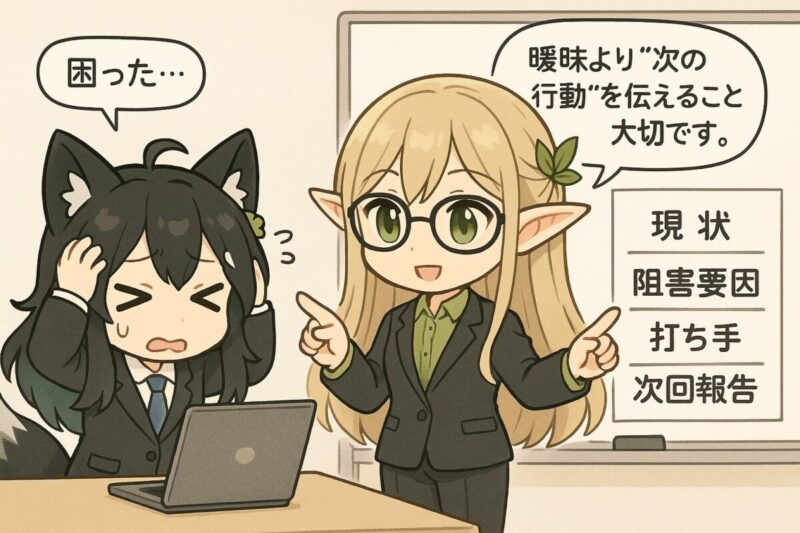 目処が立たない局面では、未確定のまま放置せず、現状、阻害要因、打ち手、次回報告時期の四点を明示する書き方が有効です。読み手配慮の観点では、相手の判断材料になる具体情報(ボトルネックや依存先の状況)を簡潔に示すことが推奨されています【3】。したがって、曖昧な表現の連発ではなく、次のアクションと連絡期限を合わせて提示すると、相手は対応を計画しやすくなります【6】。