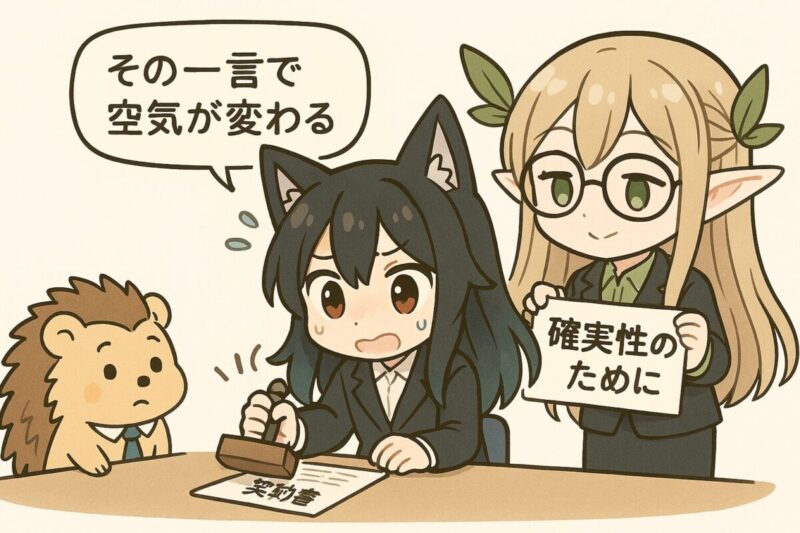 契約や重要会議の前後は、合意事項の特定と証跡化が重要です。念のためではなく、確実性のためにや安全策としてを用いて、合意の根拠や手順、責任分担を明示します。例えば、確実性のために署名前に最終版の条項一覧を共有します、リスク軽減の安全策として承認者を追加いたします、のように、行為と目的をセットで提示すると、関係者の納得感が高まります【1】【2】。
