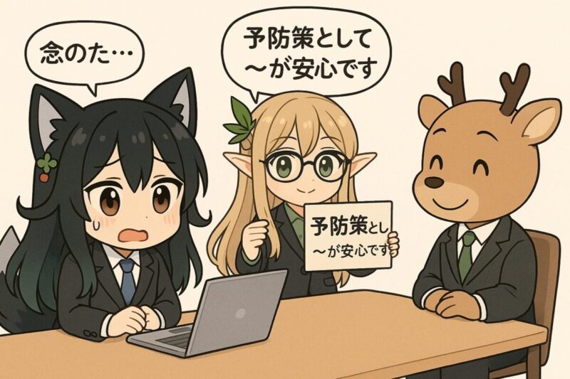 安全策としては、組織やプロジェクトのリスクマネジメント方針に沿った措置であることを示すフレーズです。個人の懸念ではなく、ルールや基準の適用であることが明確になり、主観性が薄れます。例えば、添付ファイルのパスワード分離送付、承認者の追加、当日の緊急連絡先共有などの通知と相性が良いでしょう。以上の点から、相手を不安にさせない配慮と客観性の両立が図れます【2】。
