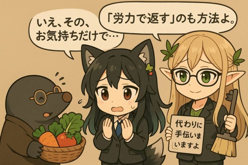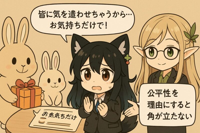 上下関係では相手の面子に配慮しつつ、場を改めて静かに伝えると角が立ちにくいです。本人だけに聞こえる声量で、いつもお心遣いありがとうございますと評価し、今後はお気持ちだけ頂ければ十分で、気を遣わせてしまうのが心苦しいと自己責任で述べます【1】【3】。返礼で埋め合わせようとすると贈与の往復が固定化することがあるため、やり取りのルール作りも有効です【1】。場合によっては、周囲に知られないようタイミングを選ぶことも配慮のひとつとなります。